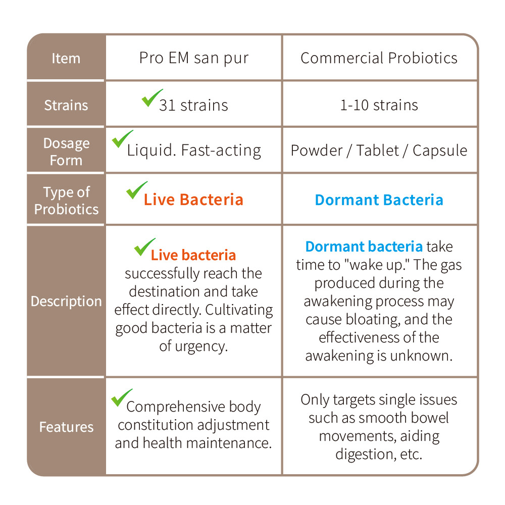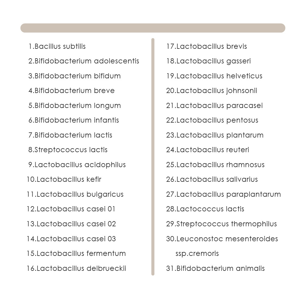 Water, Molasses and Sugar (converted into lactic acid during the production process), Probiotics (Bacillus subtilis, Bifidobacterium adolescentis, Bifidobacterium bifidum, Bifidobacterium breve, Bifidobacterium longum, Bifidobacterium infantis, Bifidobacterium lactis, Streptococcus lactis, Lactobacillus acidophilus, Lactobacillus acidophilus (A bacteria), Lactobacillus kefir, Lactobacillus bulgaricus, Lactobacillus casei 01, Lactobacillus casei 01 (C bacteria), Lactobacillus casei 02, Lactobacillus casei 02 (C bacteria), Lactobacillus casei 03, Lactobacillus casei 03 (C bacteria), Lactobacillus fermentum, Lactobacillus delbrueckii, Lactobacillus brevis (acid stem bacteria), Lactobacillus gasseri, Lactobacillus helveticus, Lactobacillus johnsonii, Lactobacillus paracasei (LP bacteria), Lactobacillus pentosus, Lactobacillus plantarum, Lactobacillus reuteri (R bacteria), Lactobacillus rhamnosus, Lactobacillus salivarius, Lactobacillus paraplantarum, Lactococcus lactis, Streptococcus thermophilus, Leuconostoc mesenteroides ssp. cremoris, Bifidobacterium animalis), Black Seed, Grape Seed Extract, Ganoderma Lucidum (fruiting bodies used as raw material, cultured in solid state).