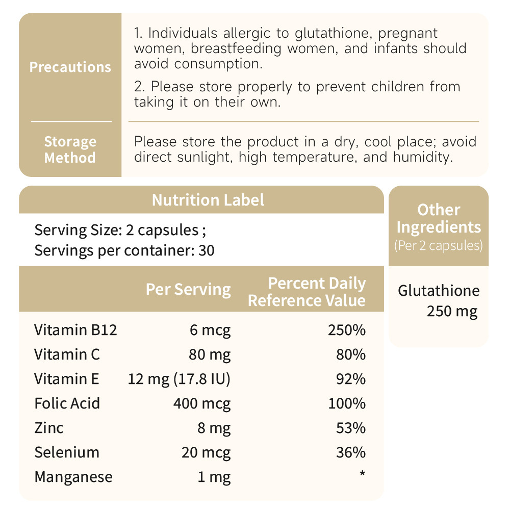 Glutathione (from Torula yeast), hydroxypropyl methylcellulose, microcrystalline alpha-cellulose, vitamin C, zinc gluconate, vitamin E (vitamin E, sodium octenyl succinate starch, silicon dioxide), manganese gluconate, silicon dioxide, sodium selenate (corn starch, sodium selenate), folic acid, vitamin B12.