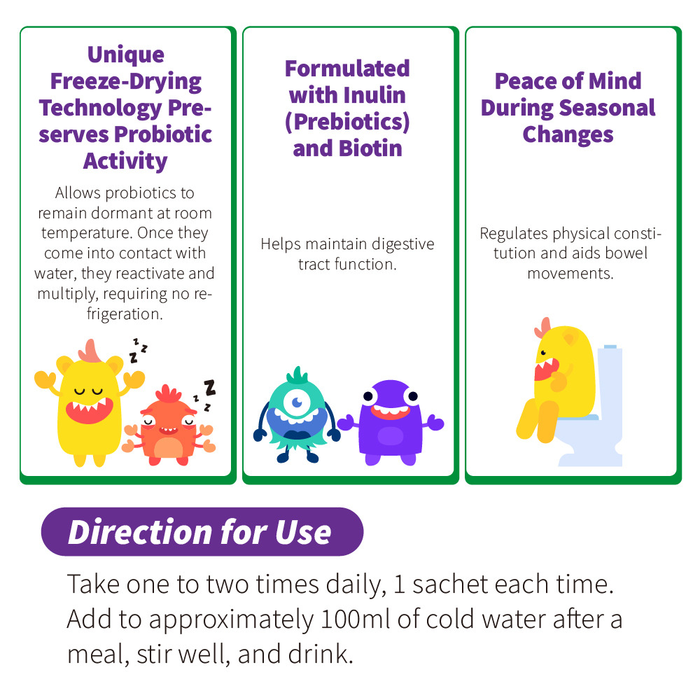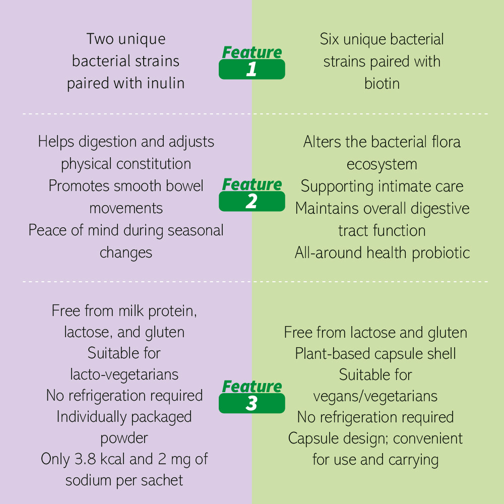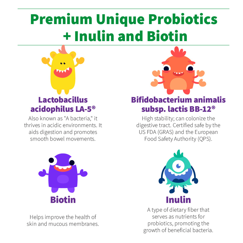 Inulin, maltodextrin, probiotics (Lactobacillus acidophilus (LA-5®), Bifidobacterium animalis subsp. lactis (BB-12®)), silicon dioxide, biotin.